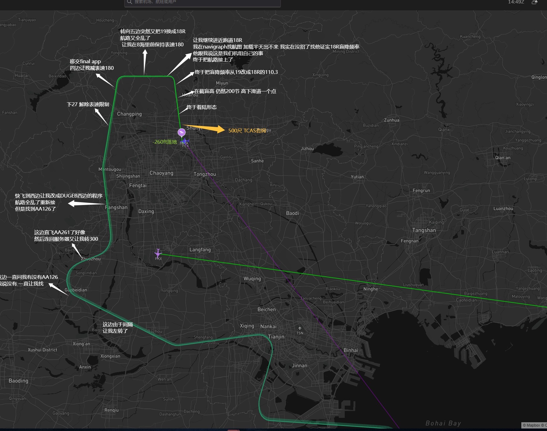 当天上的席位是ZBAA_APP,负责管完整个进近高扇,区域原本给这位大哥的是预计DUMAP进场,进我空域后因为DUMAP程序上位置有限,指挥他直飞AA126加入DUGEB程序,这句直飞AA126加入DUGEB程序的指令发了至少三次大哥才理解,在这段时间里他还在没有核实航点的情况下自行飞向一个不知名航点,导致了一个和其他飞机的冲突。