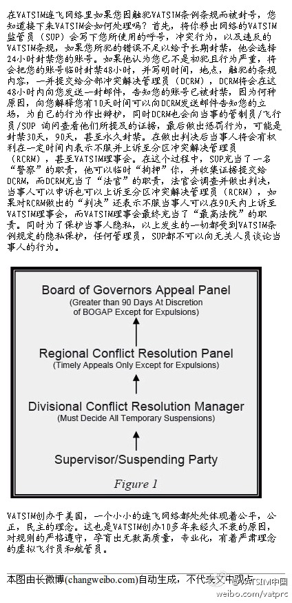 》中查阅到这些信息。那么为什么有些人会觉得在VATSIM飞行很困难呢,我想最大的一个原因就是我们的母语是汉语而不是英语,那么VATSIM对英语的要求到底有多高呢?对于大部分人来说我们在高中学习的英语知识便足以应对(分部的管制员有少数几个高中生,而且他们管制能力很优秀),如果你只打算用文字和管制员交流的话,甚至一个毕业或者在读的初中生英文水平便足够了!然而和很多在国内连飞平台经常飞行的飞友交流后发现,大部分人对VATSIM抱着一种畏惧心理,认为这是一个高不可攀的连飞平台,自己没有能力在这里飞,或者认为VATSIM是一个对英语要求极高的连飞平台,英语不好所以放弃了。国内飞友对VATSIM的偏见导致很多人因为失去了体验在一个国际化连飞平台中飞行员的乐趣,本文既是一份新手指南,也是为了消除大家对VATSIM的种种偏见。 1.为什么要选择VATSIM? 在VATSIM连飞的第一个优势便是,你可以领略到全世界各个地方的虚拟管制员的风采。虚拟飞行员的最大乐趣就是可以不受时间空间的限制畅游全世界各地有名的机场,然而空荡荡的模拟飞行时间里没有了管制员和飞行员之间的沟通,这种模拟真实的乐趣便大打折扣。VATSIM在全球主要国家和地区几乎都设立了分部或者VACC(虚拟航管区),这些分部或管制区基本上都是由当地人组建并运作,当你在这些空域飞行时,听到耳机里传来带着当地口音的英语,繁忙而急促的陆空对话,恍惚间你会觉得自己是一名真实的飞行员,坐在机舱里,背后有一两百名乘客的生命安全寄托在你的身上,你的职责就是安全抵达并降落目的地,顿时对飞行的严肃性便油然而生,你再也不会像以前那样恶作剧般使用波音747这种民航客机做出翻跟头,俯冲下降等不负责任的举动,这种对待模拟飞行的严肃性,严谨性,方可体验到模拟飞行最大的乐趣-as real as it gets,没有什么不可以当真!VATSIM飞行的第二个优势,你所遇到的管制员,大多都是经验丰富且乐于助人。VATSIM管制员都经过了当地分部的培训,考核后方可进行管制服务,然而你也会遇到许多管制新手,他们在发出指令时可能吞吞吐吐,可能会偶尔犯错,但是他们的态度绝不含糊!试想你第一次在VATSIM飞行会是什么样的呢?我自己的经历就是我连滑行道都不认识直接误闯跑道,在这里我也要感谢那位宽容的波士顿塔台管制员,他了解我是一个英语很烂的新手,耐心指挥我离开跑道,直到进入规定的起飞跑道,他所表现出的专业态度,深深打动了我,也坚定了日后在VATSIM努力飞行的决心。因而我们大家都要互相体谅对方,管制员为你提供了服务,你对他工作的支持便是他最大的欣慰。时刻保持礼貌与尊重也是VATSIM对飞行员的基本要求。VATSIM飞行的第三个优势,规则。很多人一听到规则立马头大,因为我们每个人都不喜欢规则,规则约束着我们而没有自由。VATSIM同样有无数的规章制度,但是这些制度是为了约束飞行员,管制员的行为,为了让VATSIM连飞网络规范有序。那么谁来监督这些飞行员,管制员呢,他们叫SUP(supervisor)即监管员,他们有着严格的值班时间,保证24小时都有SUP维护者VATSIM网络的秩序,没错,24小时,365天!点击这里你可以看到最新的SUP名单。下面我用一张微博图片向各位简单介绍VATSIM是如何处理一个封号事件的。