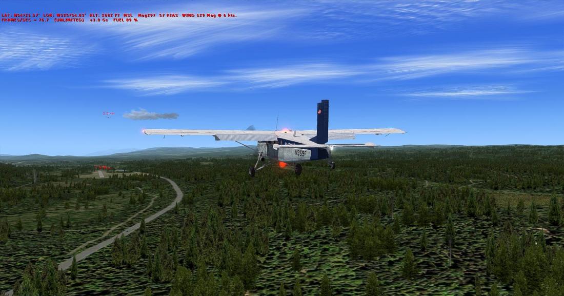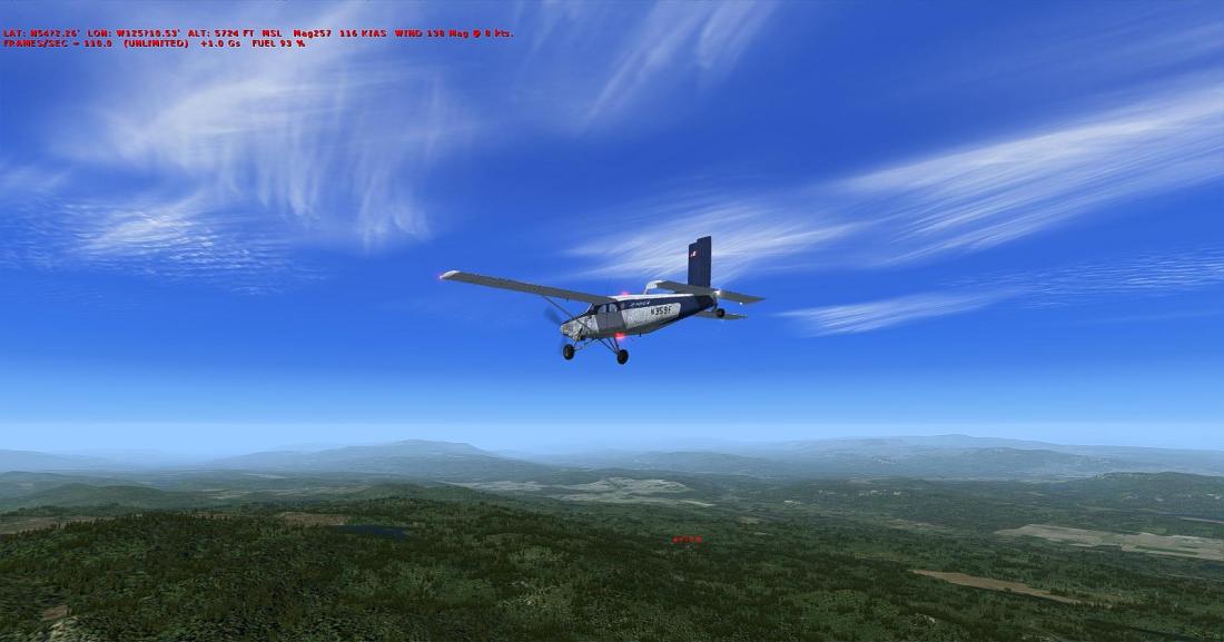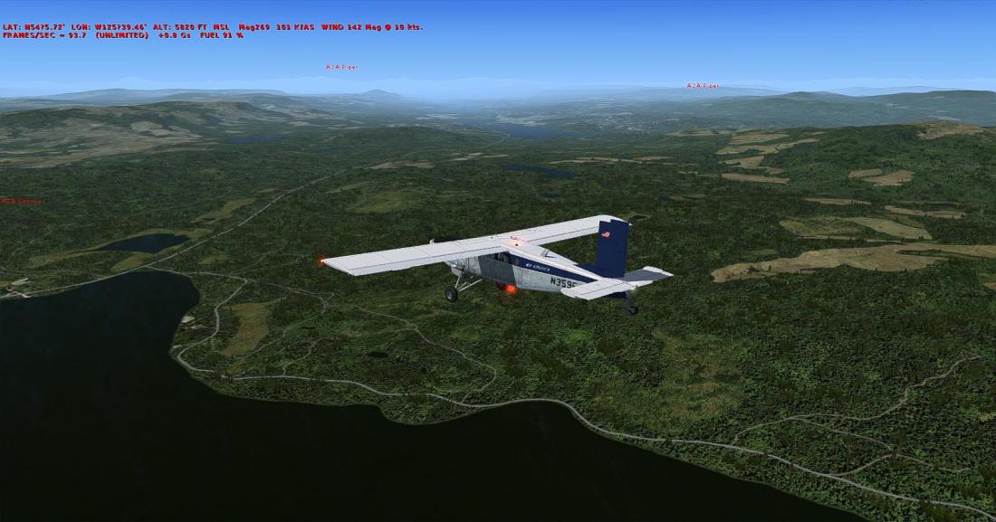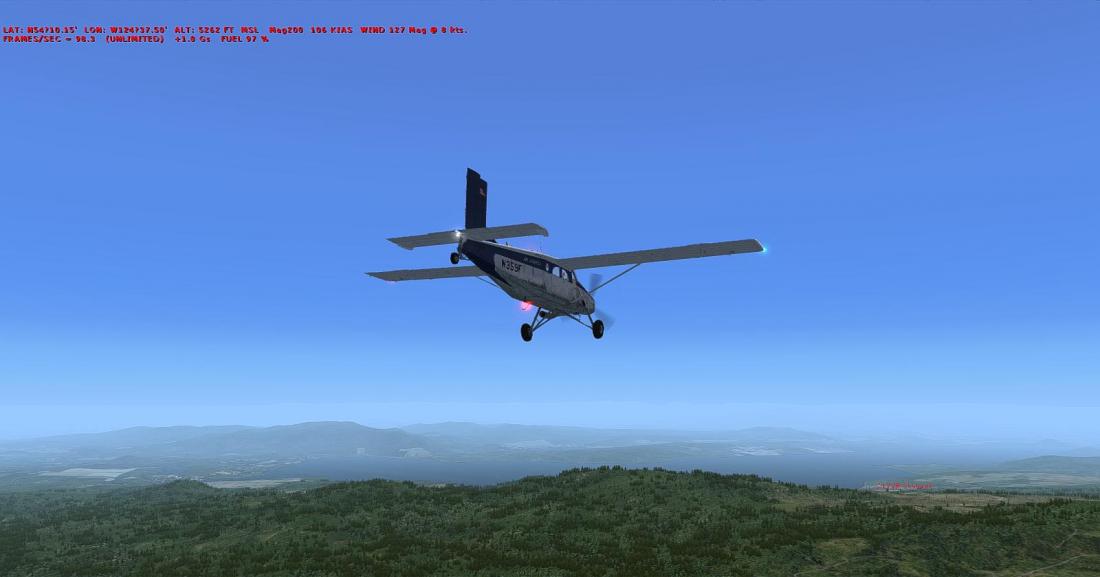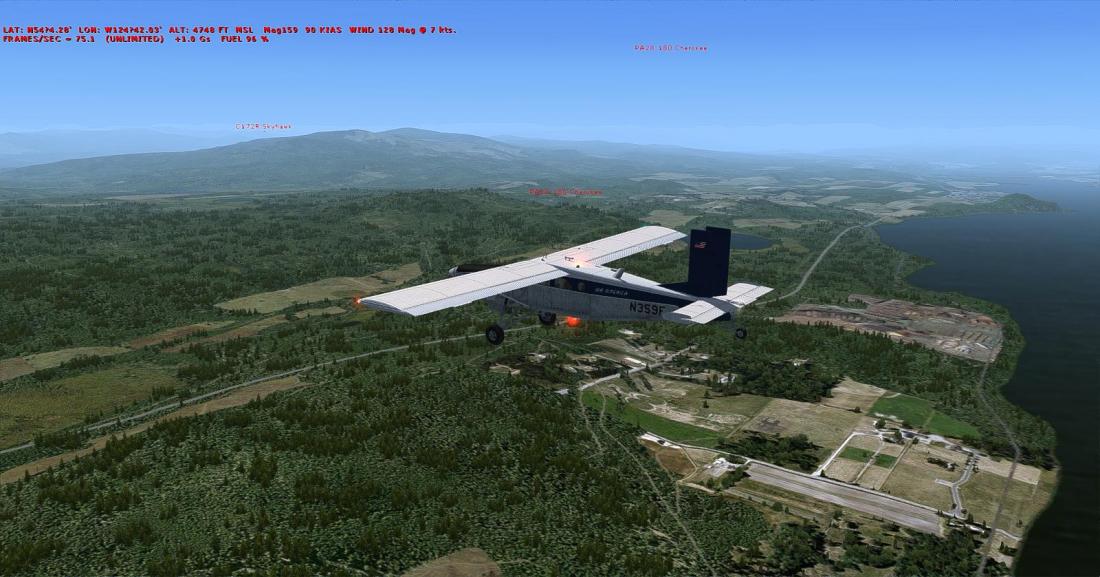 起飞后大致航向飞197,向西南方向穿越丘陵地带后,抵达在弗雷泽湖南侧的弗雷泽湖机场(CBZ9_FRASER LAKE)。