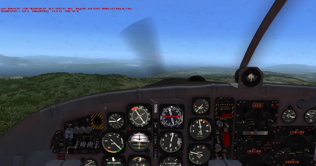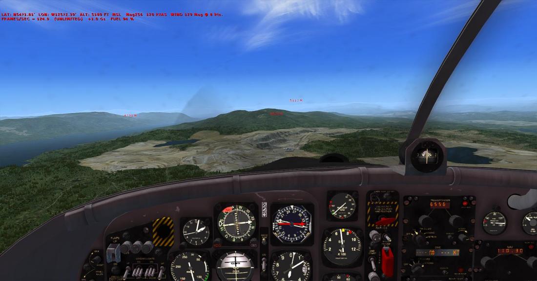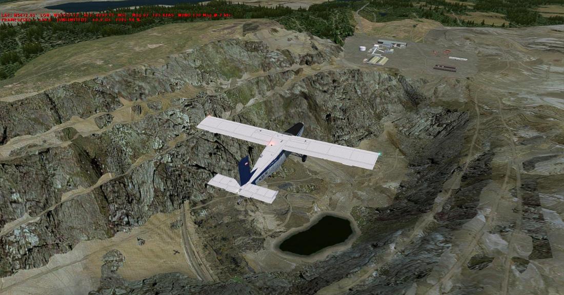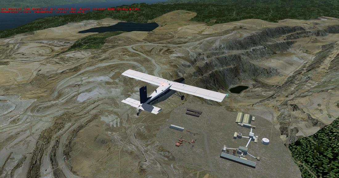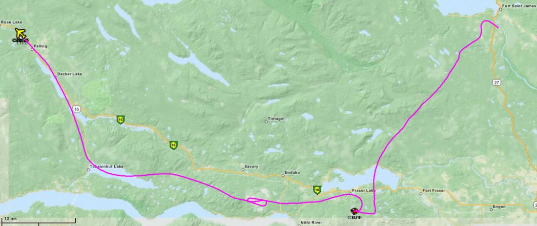 从矿区上空右转航向西北,大致飞285。目视切辛克湖(Tchesinkut Lake)后转向北,参考16号公路并最终在伯恩斯湖机场降落(CYPZ_Burns Lake)