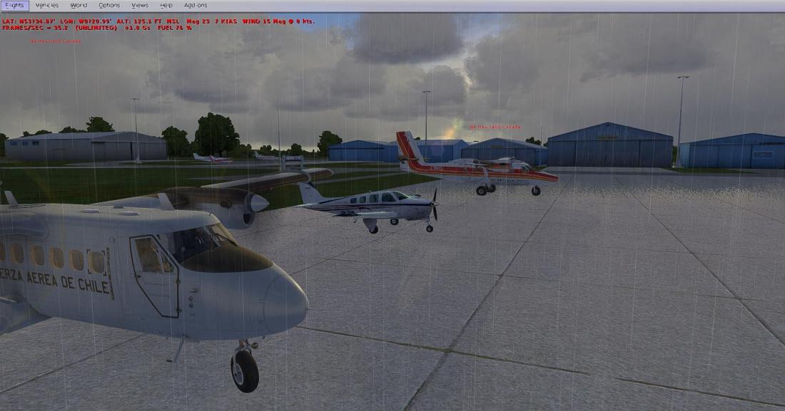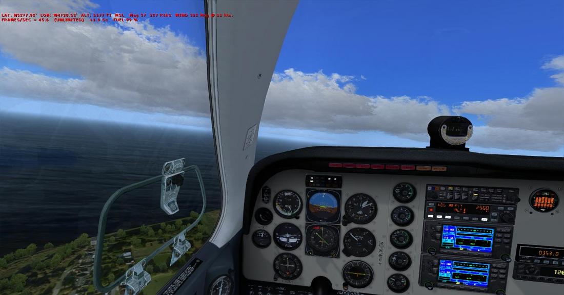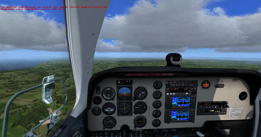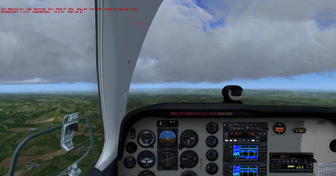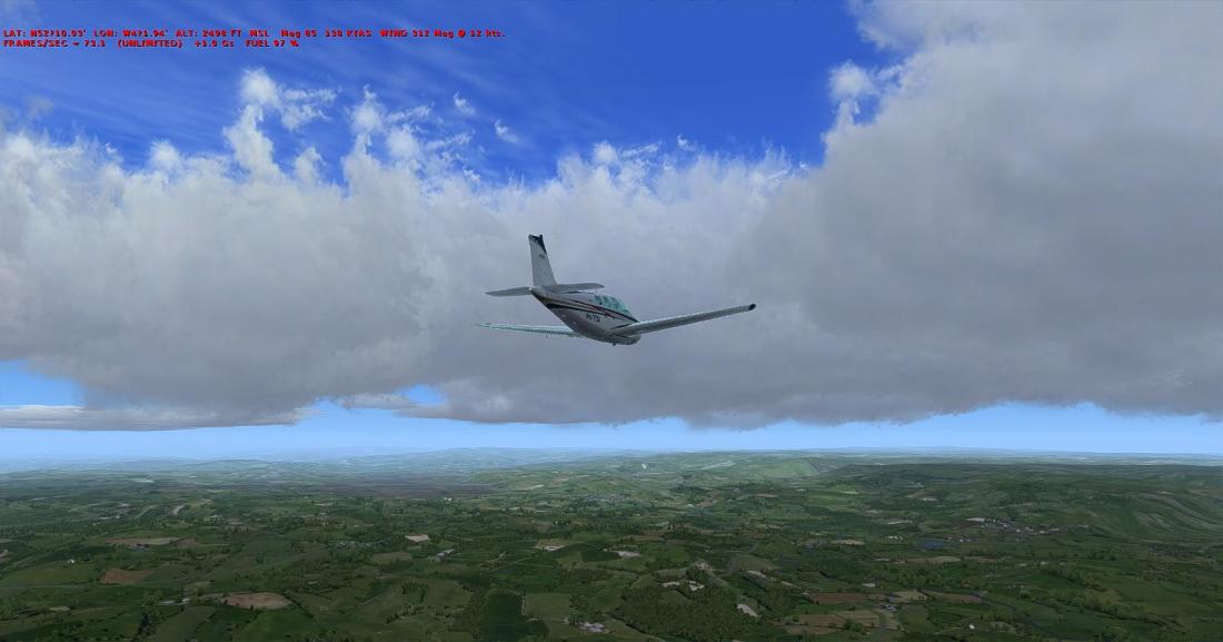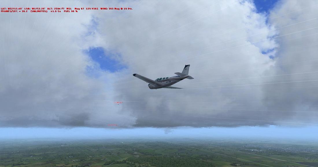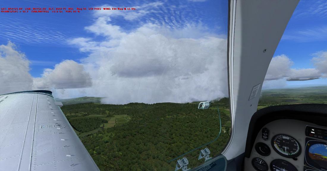 天空中厚厚的云层,不时的有闪电划过,我们保持2500英尺高度,妥妥的飞在云层下方。