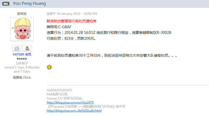 这里再次感谢You Peng Huang(H-1604/CFSO2475/Cleve Pig)兄的提醒,还好我只收到个处罚通知单, 这要是把我扔小黑屋里关几天可够受的哈 https://forum.vatprc.net/uploads/emoticons/default_smile.png" alt=":)">