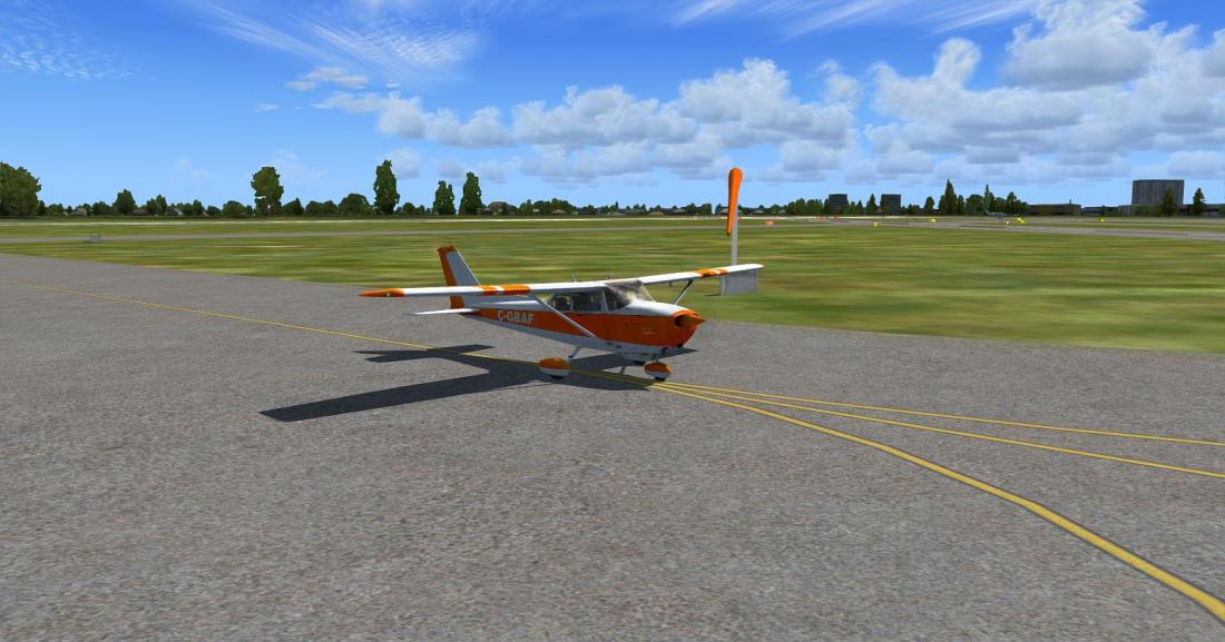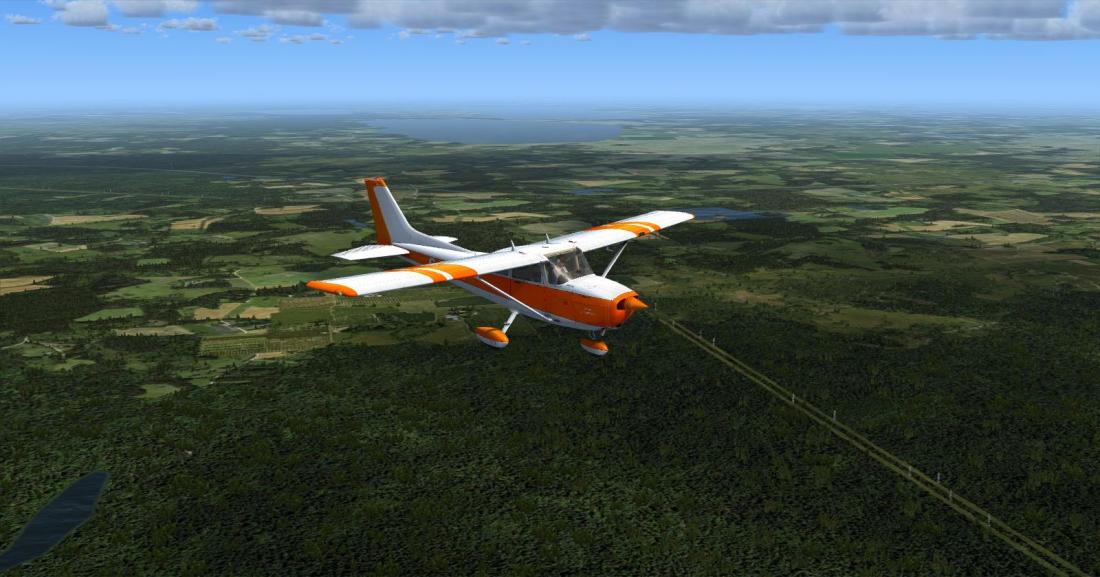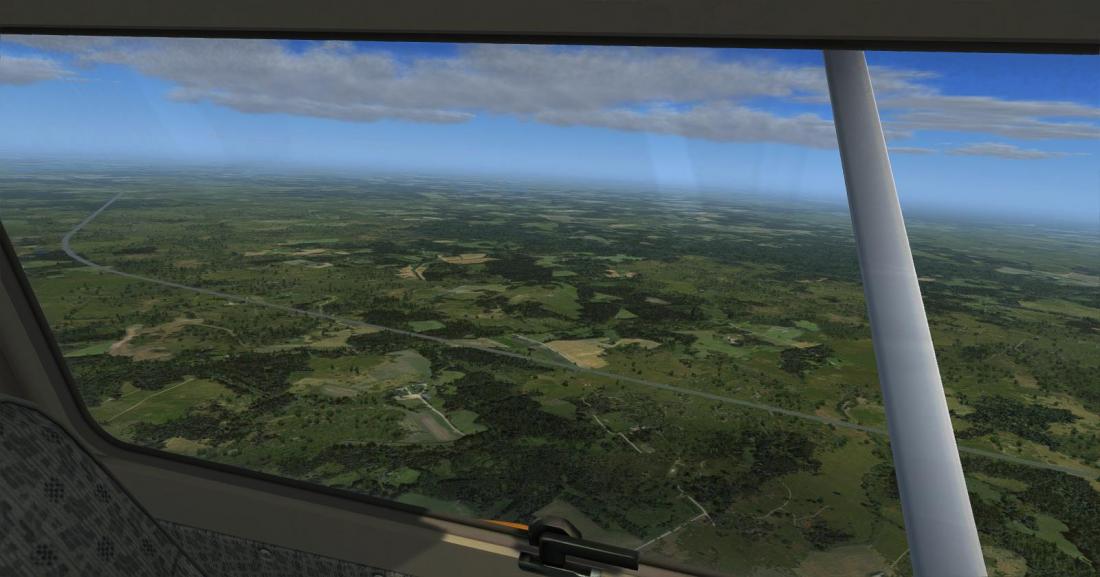 前方目视机场53FA。美国东岸的大部分机场ORBX都没有重制,这里只能看到默认地景的一条孤零零的跑道。 一条国道跟高速并行,机场在靠近国道的一侧。