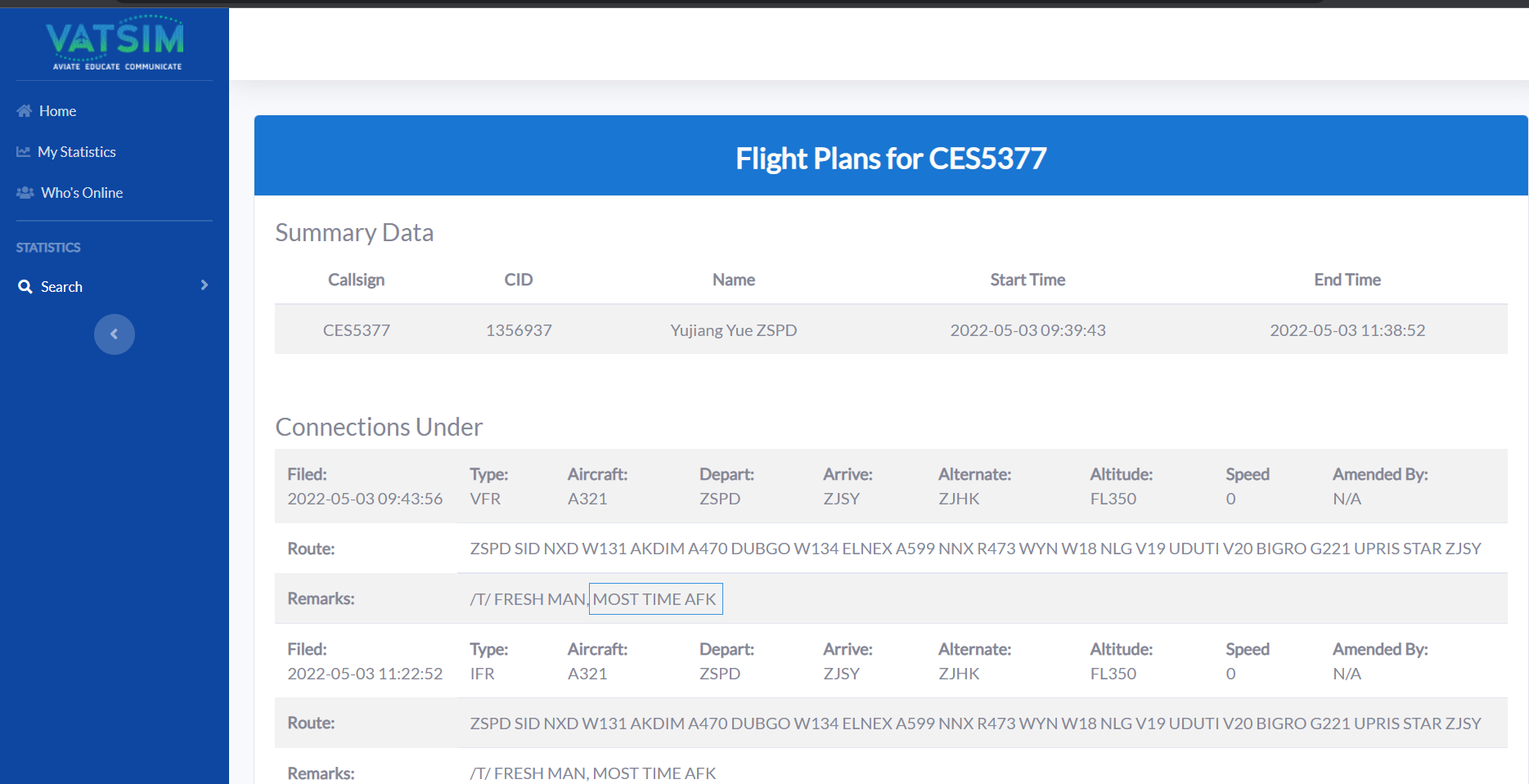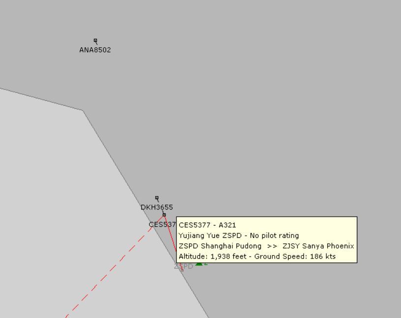 然后就在此时,TCAS警戒报TRAFFIC,显示正前方有冲突,查看vatspy,确认有一呼号为CES5377的A321从35R起飞,未转向避让、并持续爬升接近(如图)。我在122.80的unicom呼叫数次未果后,由于冲突存在无法建立稳定进近,只得放弃进近并复飞避让。执行复飞中再次寻找该机组,然而无论TCAS还是vatspy均无法找到,疑似在执行复飞时该机组已断线。